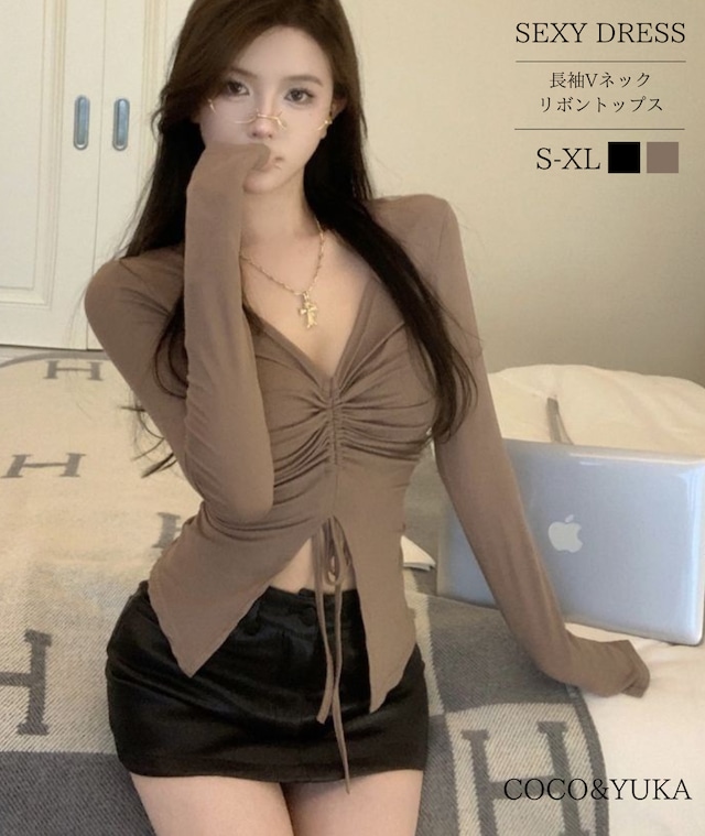 胸元とウエストのデザインがセクシーな、 COCO&YUKAのへそ出しデザインの長袖トップス。 フロント部分は紐で開き具合を調整できる仕様になっており、 引っ張ることで胸元はVネックになり、 デコルテや谷間をきれいに強調できます。 お腹部分もお好みのバランスで調整できるため、 ヘルシーな肌見せからセクシーな着こなしまで自在。 身体にぴったりフィットするタイトシルエットで、 スタイルアップ効果も期待でき、 着るだけでトレンド感のあるコーディネートが完成します。 ハイウエストのスキニーパンツや、 ミニスカートとの相性も抜群。 おへそはチラ見せ程度なので、 セクシーすぎずヘルシーカジュアルに着こなせるトップスです。 商品ポイント ・へそ出しクロップド丈トップス ・胸元・お腹の開き具合は紐で調整可能 ・Vネックデザインでデコルテを美しく演出 ・ぴったりフィットするタイトシルエット ・ハイウエストボトムやミニスカートと好相性 【 ブラック / ブラウン 】 ( S ) 着丈53cm バスト74cm ウエスト62cm 肩幅34cm 袖丈58cm ( M ) 着丈56cm バスト78cm ウエスト68cm 肩幅36cm 袖丈59cm ( L ) 着丈57cm バスト80cm ウエスト70cm 肩幅37cm 袖丈59cm ( XL ) 着丈58cm バスト80cm ウエスト72cm 肩幅38cm 袖丈60cm ※横に4cmほど伸縮性あり。 ストレッチあり