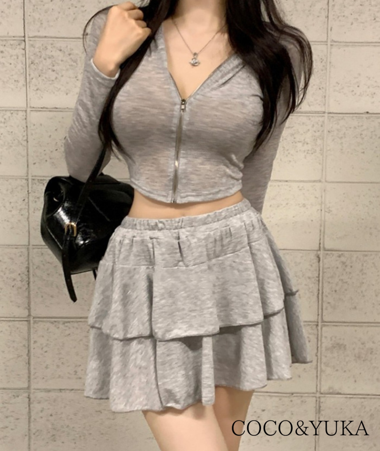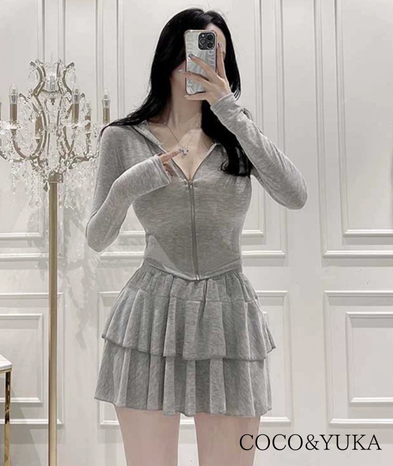 タイトなジップアップフーディーと、ふんわり広がる2段ティアードフレアスカートの上下セットアップが新登場!