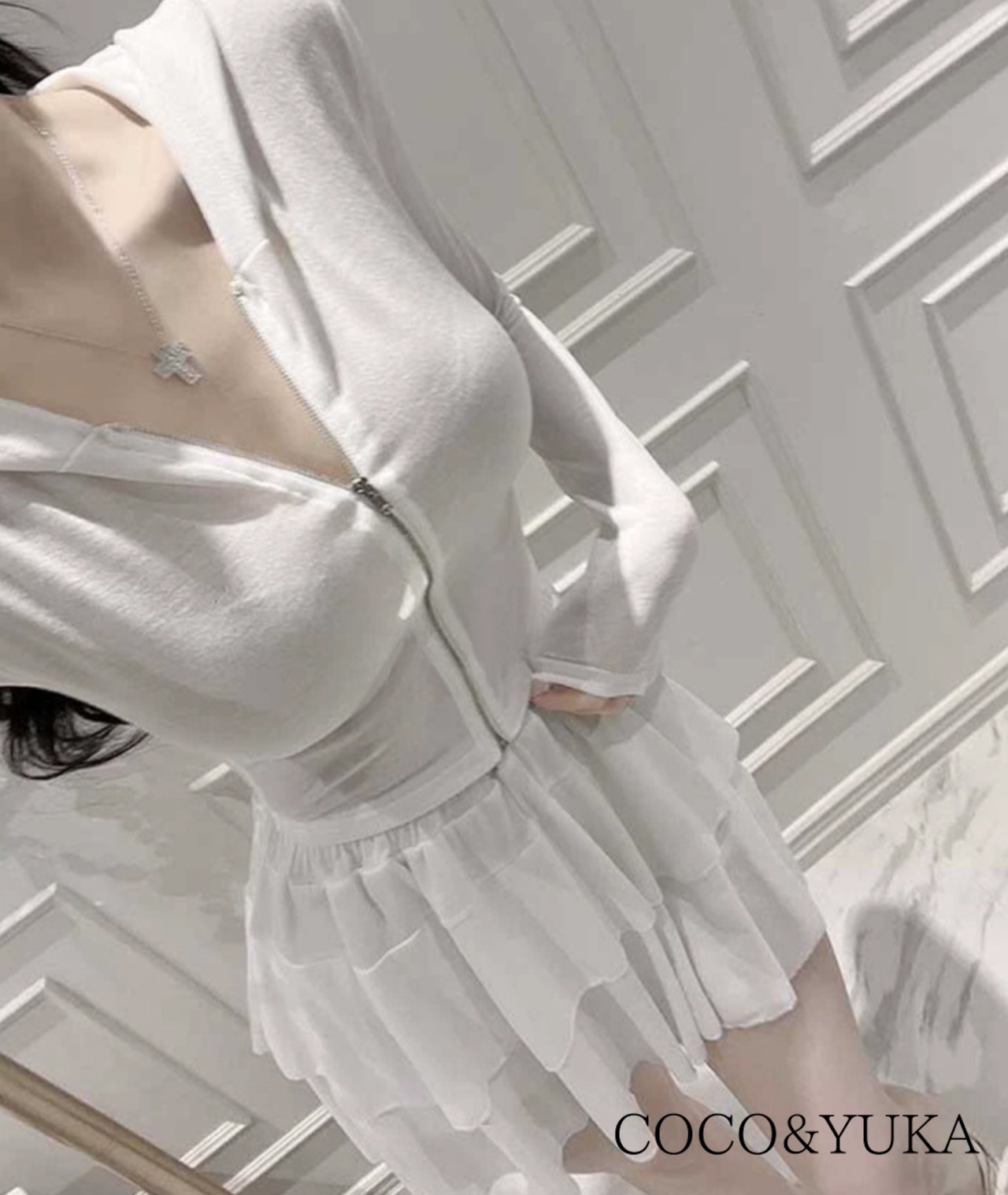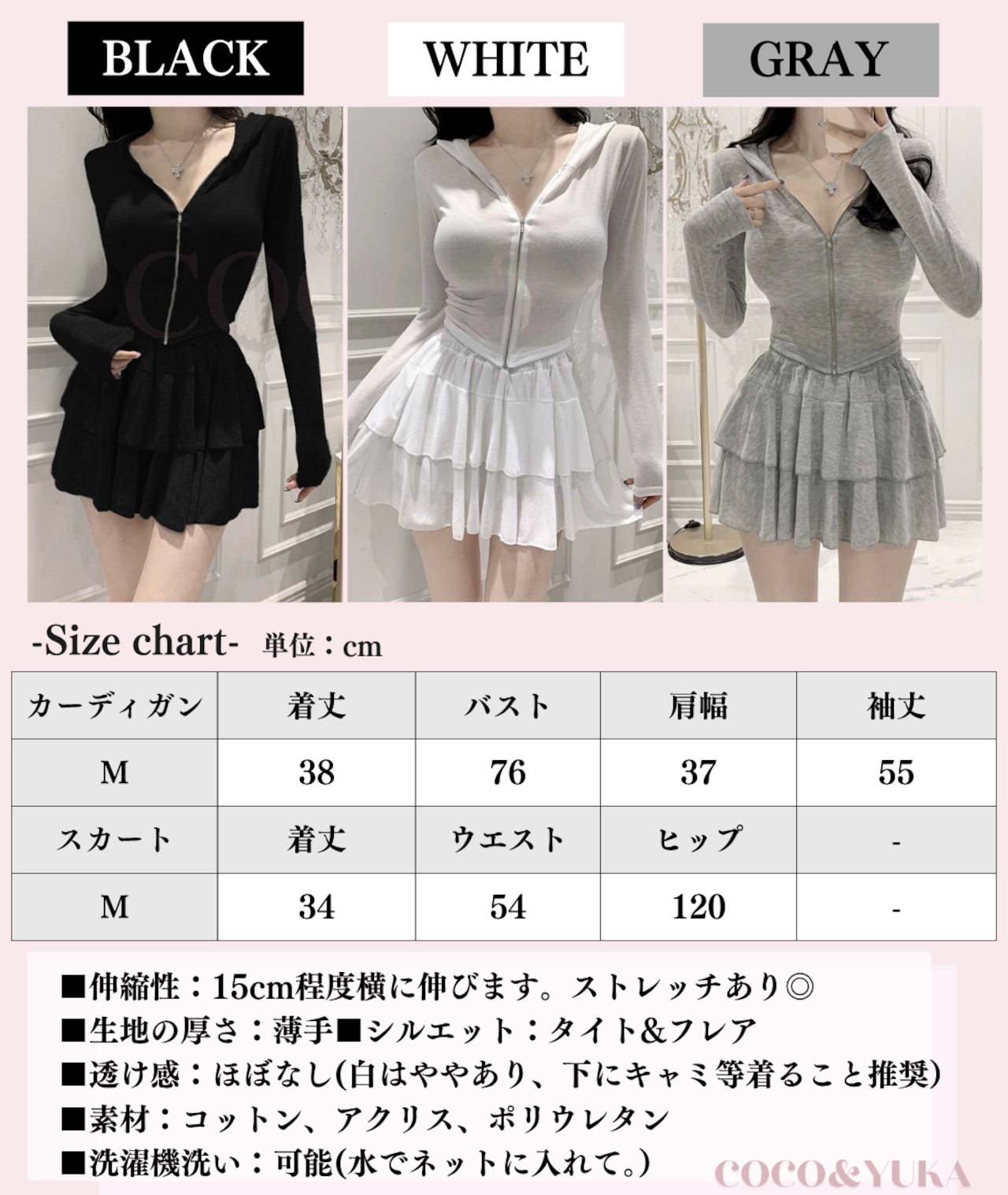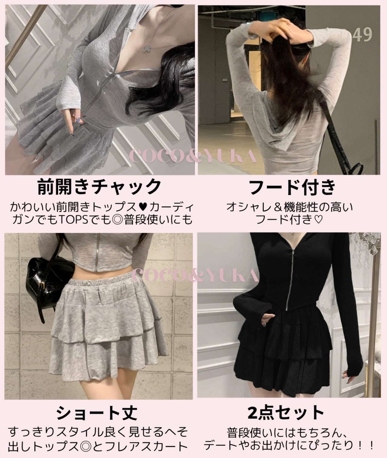 [ココアンドユカ] かわいい 2点 セット 長袖 前開き カーディガン ミニ フレア スカート セクシー フード 付き タイト トップス チャック ウエストゴム ティアード フリル ミニスカート 上下 セットアップ レディース B0FFSC4GV6