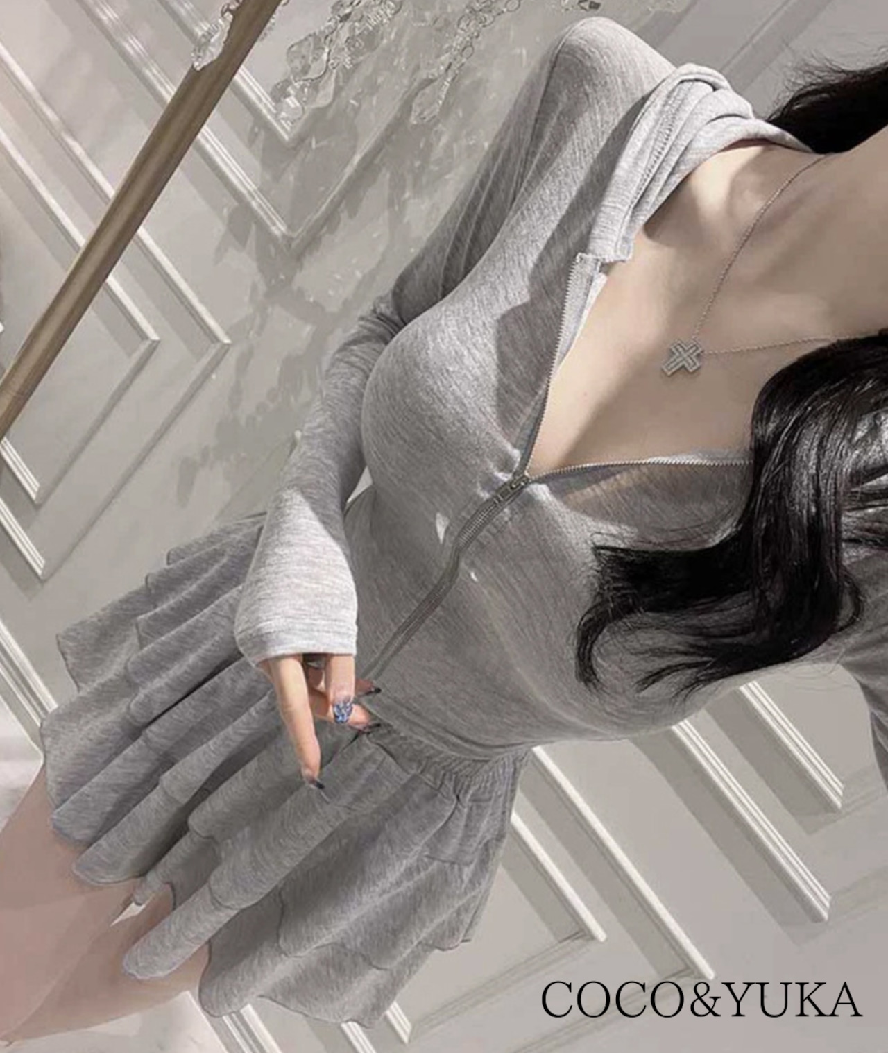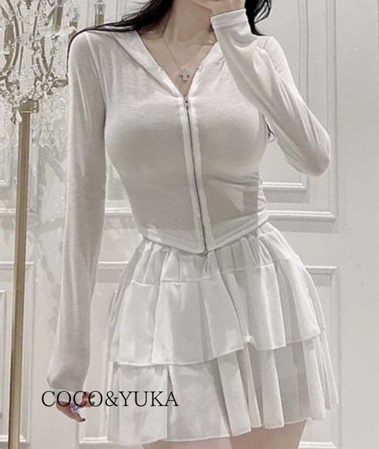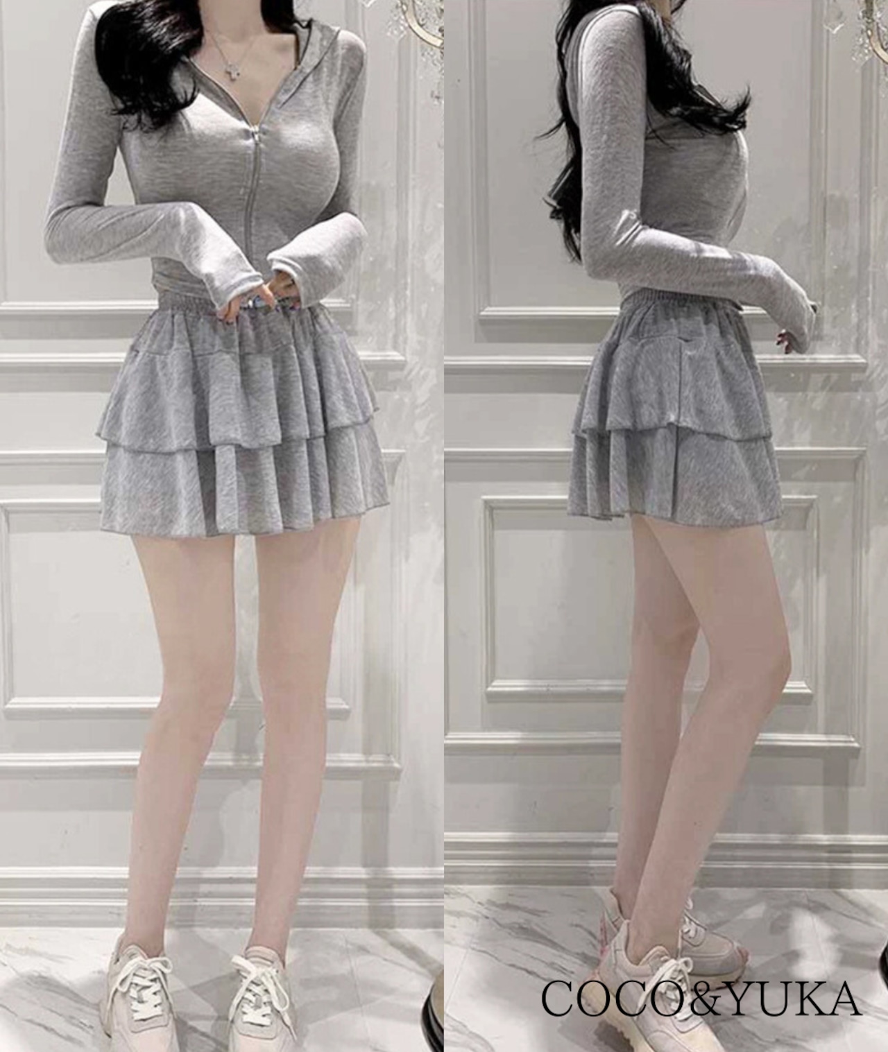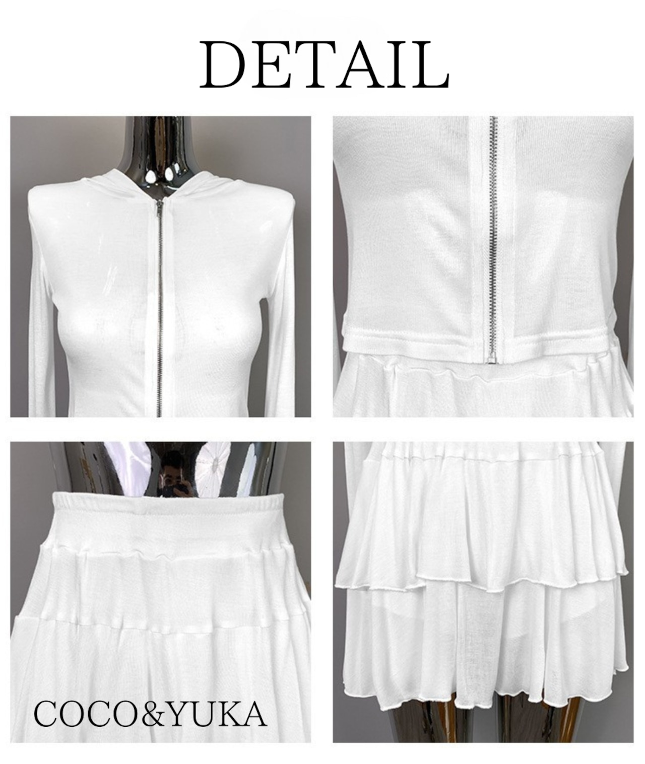 [ココアンドユカ] かわいい 2点 セット 長袖 前開き カーディガン ミニ フレア スカート セクシー フード 付き タイト トップス チャック ウエストゴム ティアード フリル ミニスカート 上下 セットアップ レディース B0FFSC4GV6