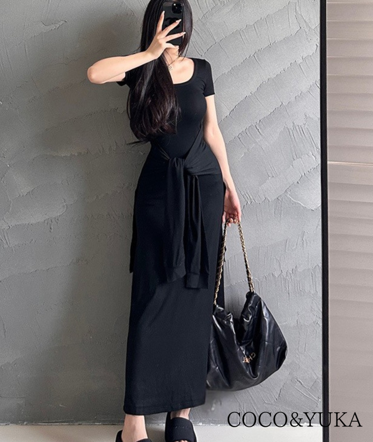 [ココアンドユカ] 半袖 タイト セクシー ロング ワンピース ウエスト リボン マキシ丈 夏 ワンピ リゾート 無地 きれいめ Uネック オフショルダー カジュアル おしゃれ レディース B0FN2J6Y9Y