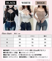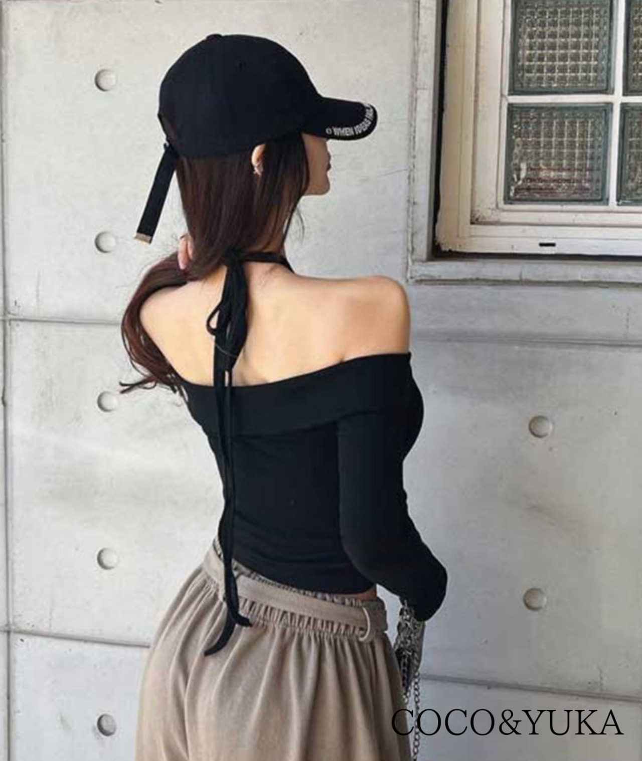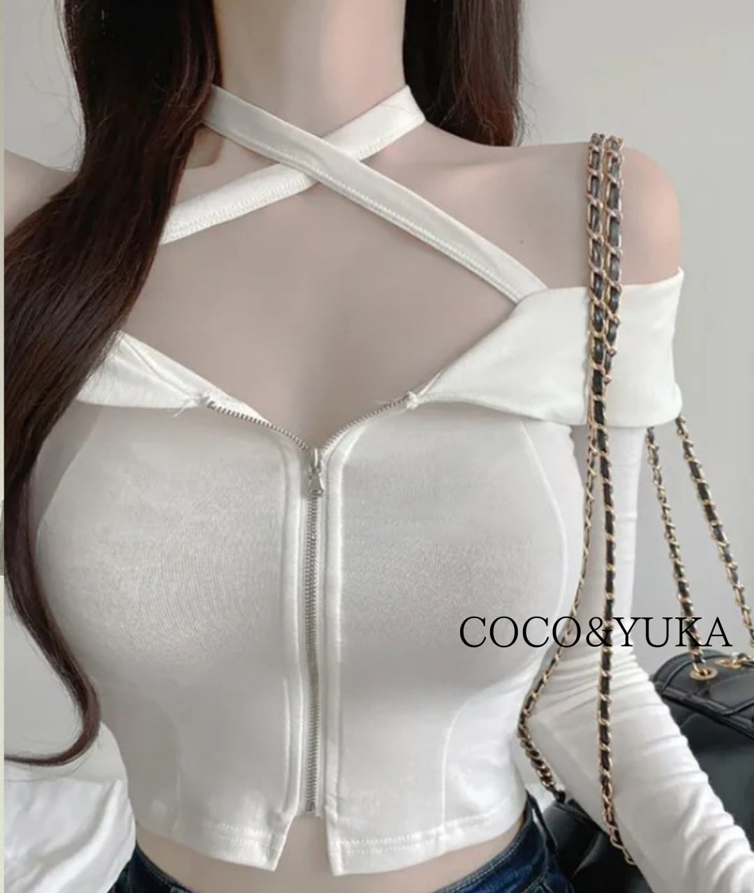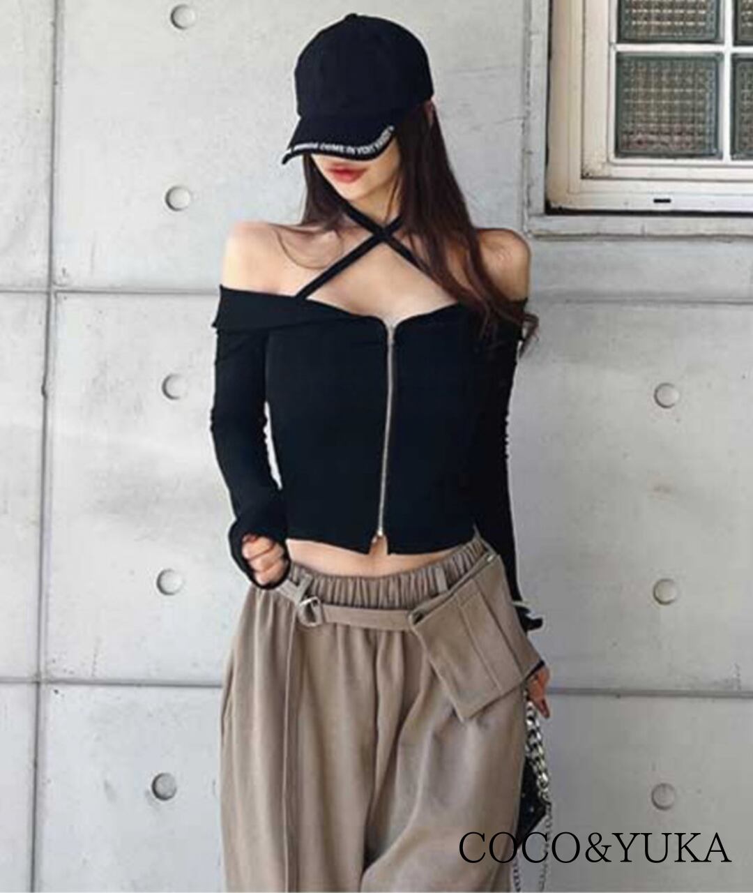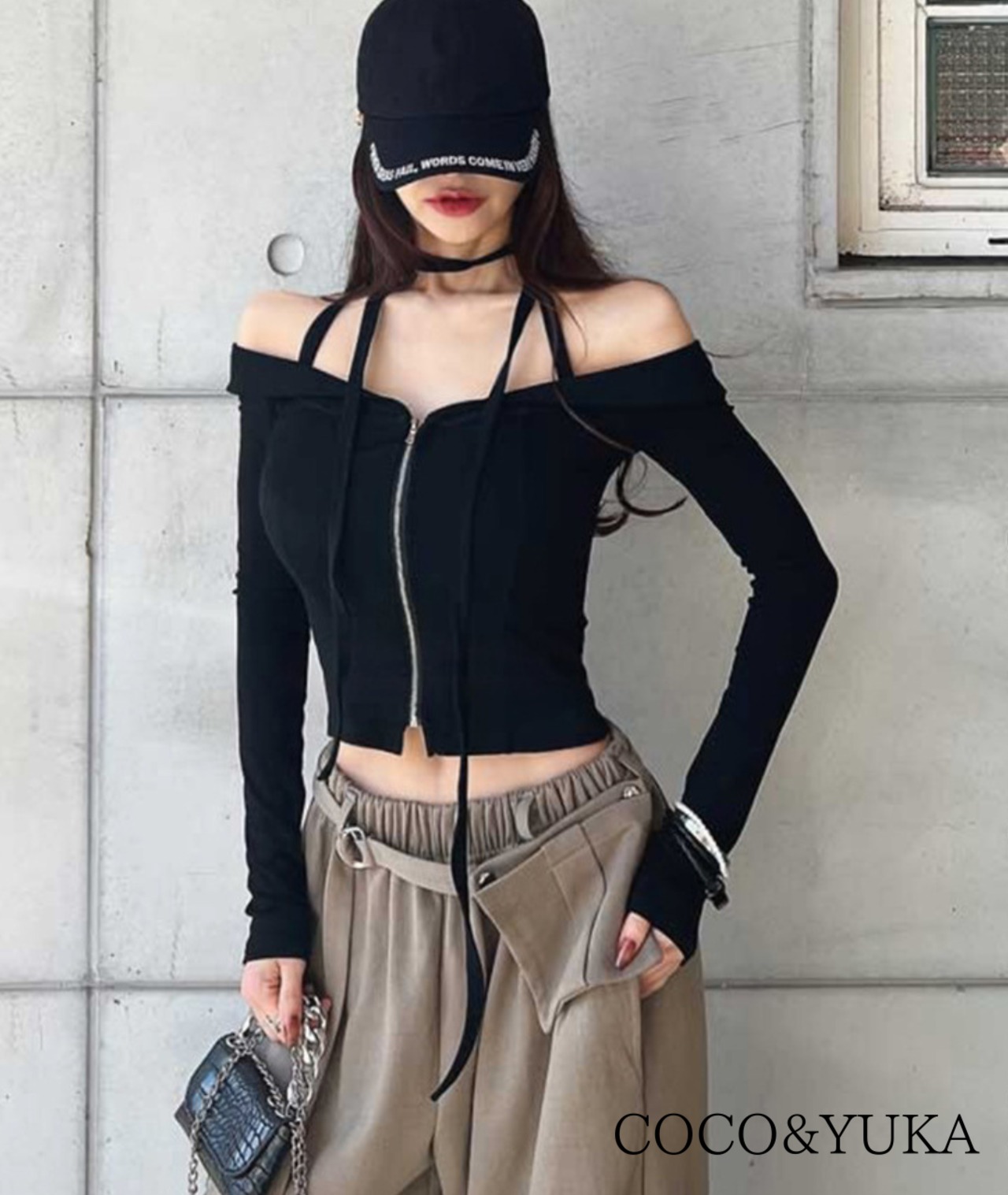 [ココアンドユカ] オフショルダー フロント ジップ セクシー トップス レディース 長袖 肩出し タイト 胸開き 無地 シンプル ロンT リボン カットソー B0FS69HY7B | COCO&YUKA