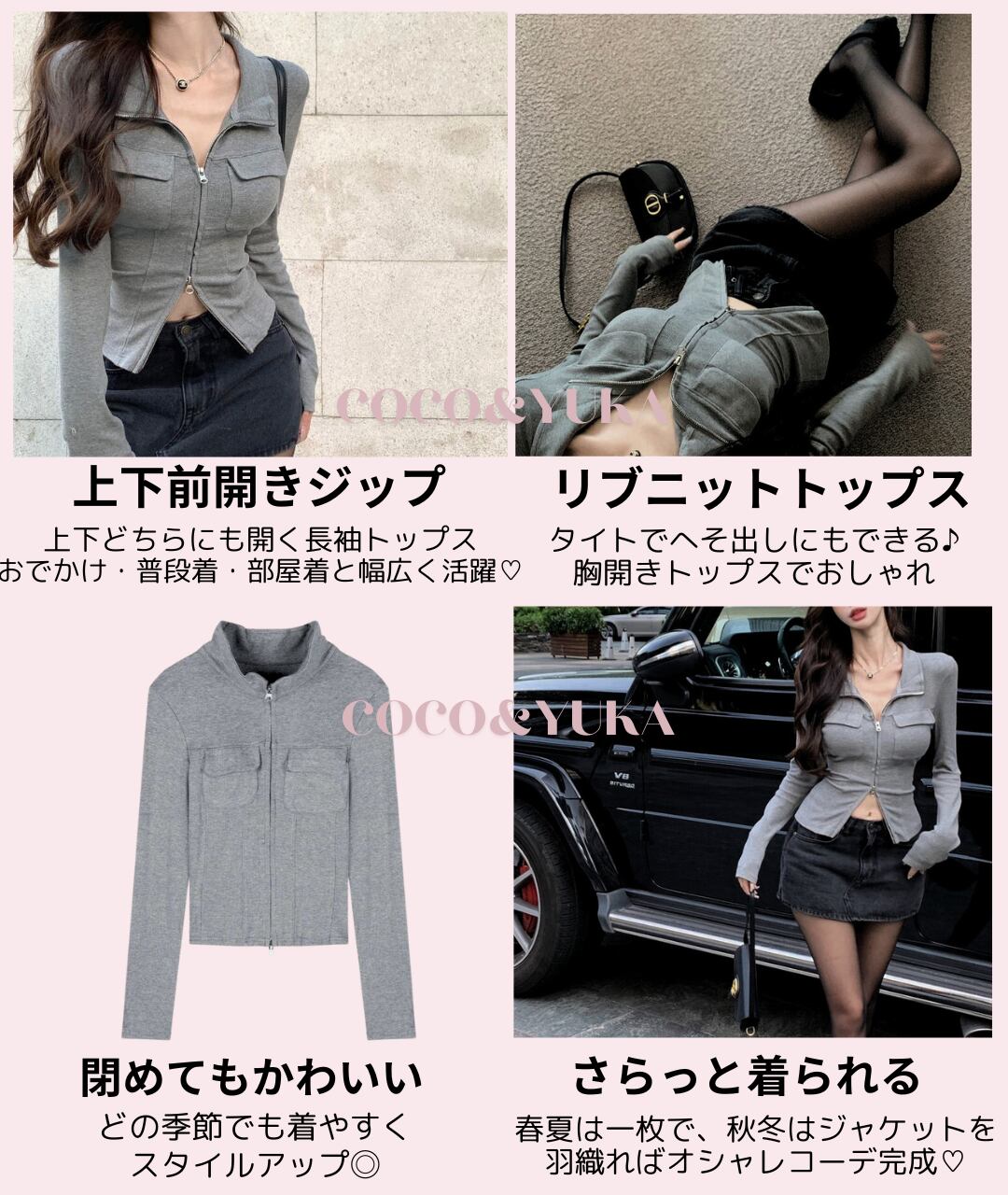 [ココアンドユカ] リブニット セクシー トップス 長袖 フロントジップ ハイネック Vネック レディース へそ出し タイト 胸開き 薄手 シンプル カジュアル B0FS1L9GRJ | COCO&YUKA