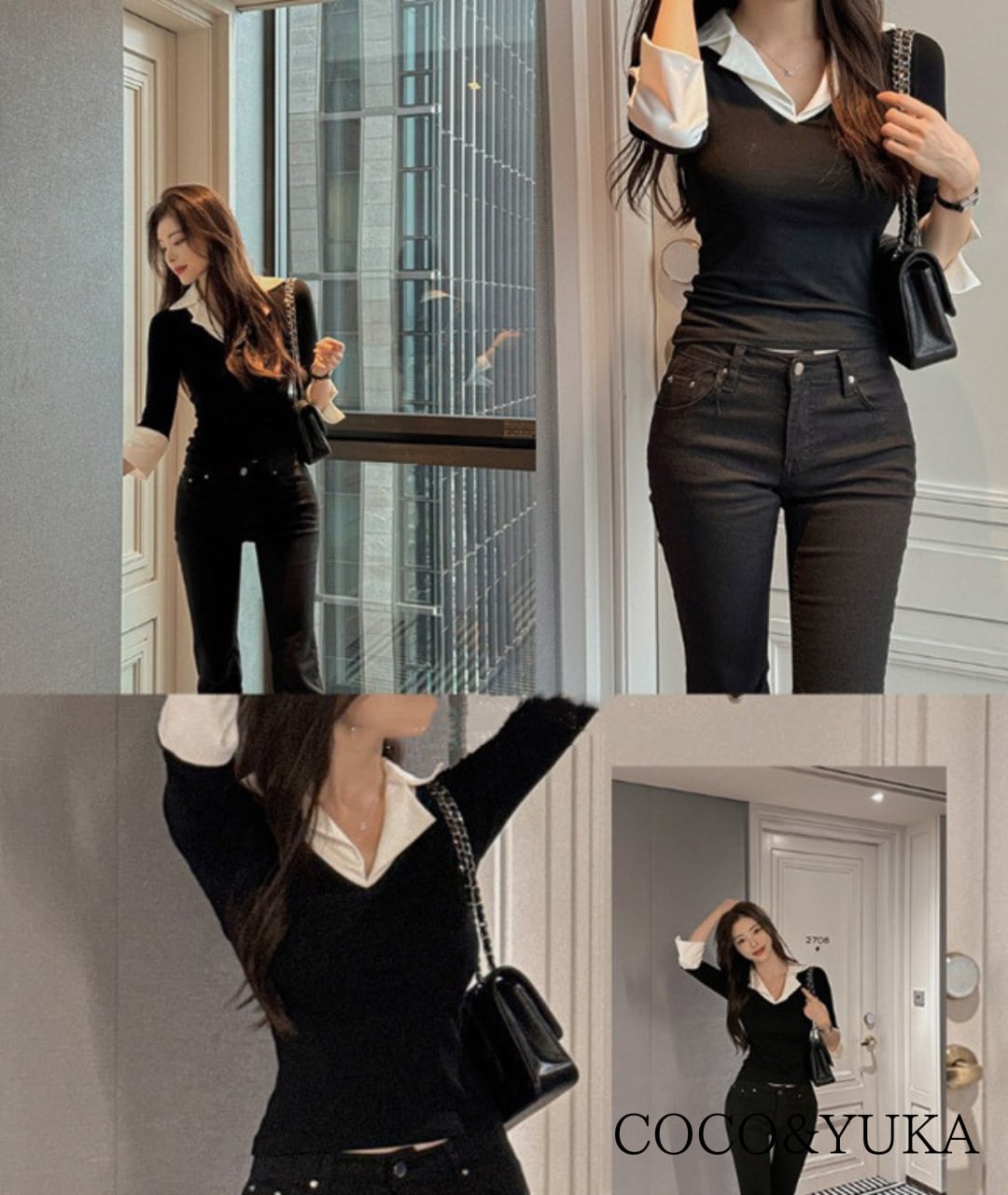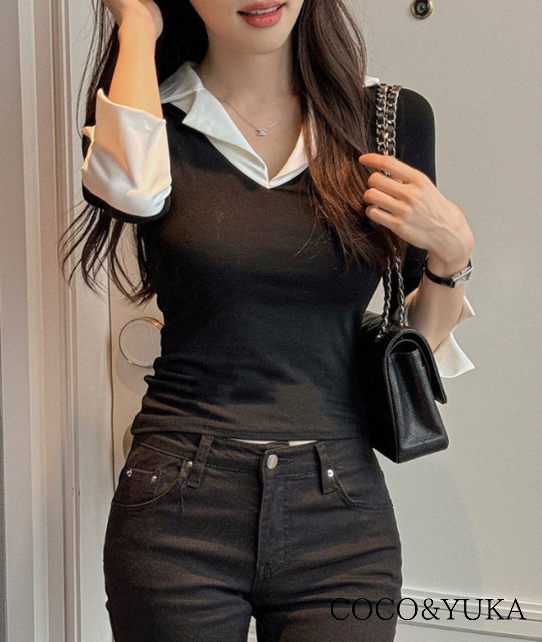 シャツの襟と袖口をあしらったデザインで、1枚でレイヤード風のスタイルが完成します。