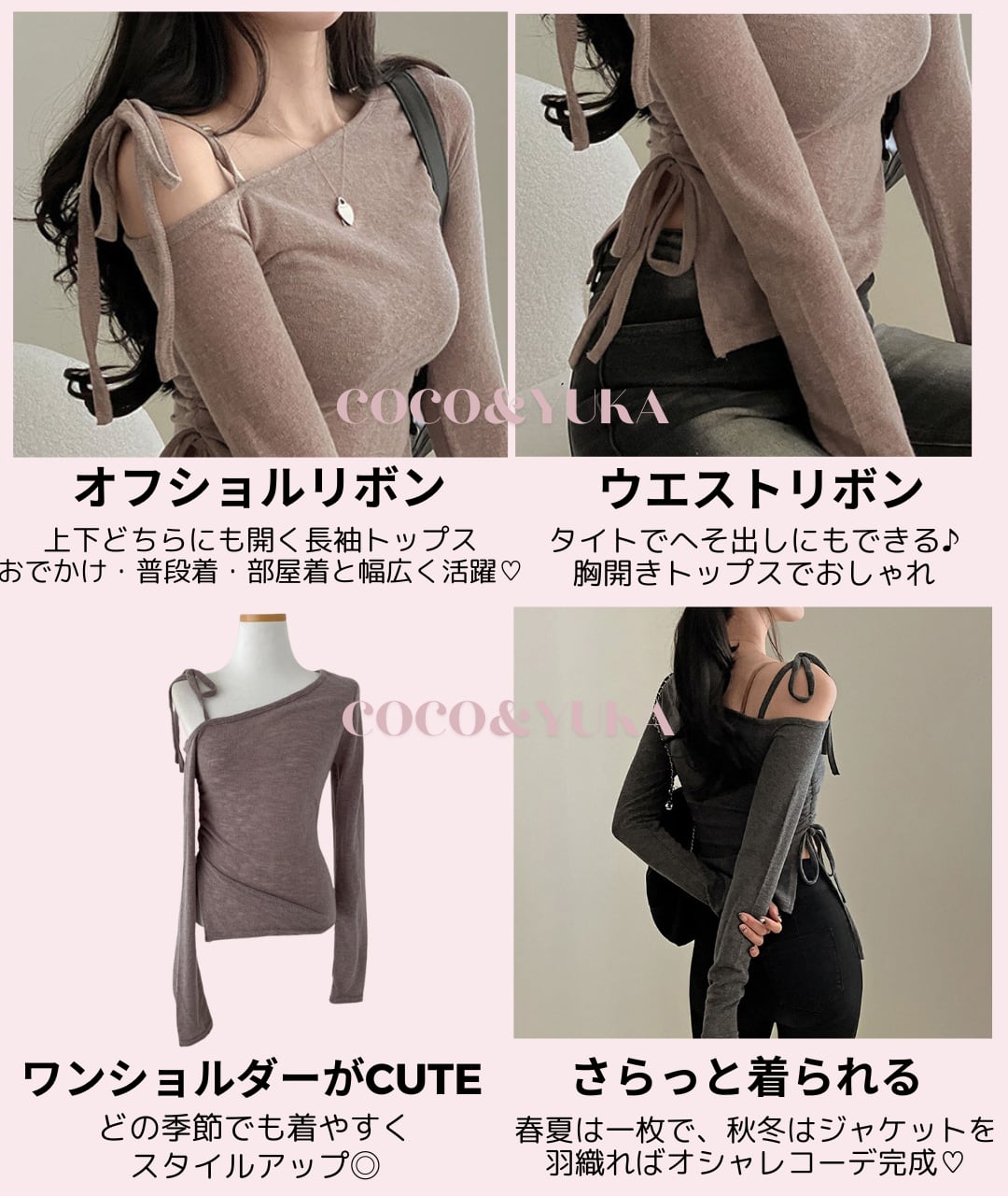 肩をきれいに見せるオフショルデザイン。タイトなシルエットで女性らしいラインを強調し、フェミニンで大人可愛い印象に。
