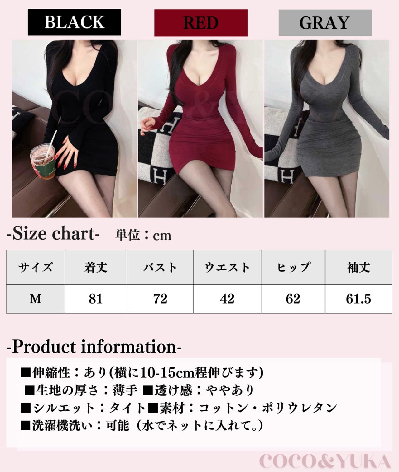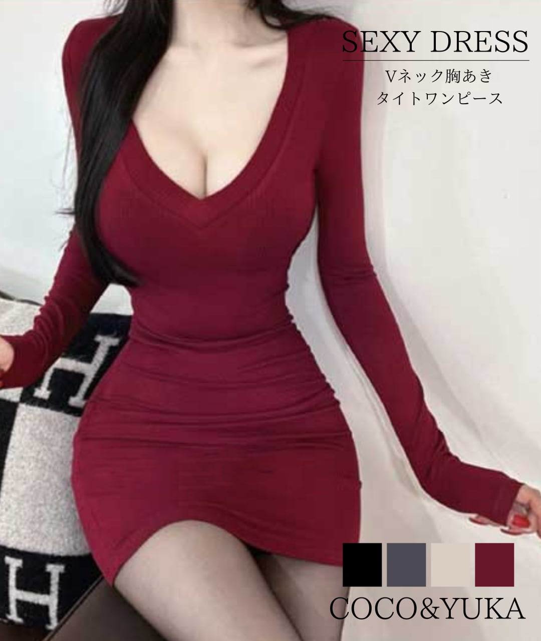 このVネックのタイトワンピースは、大胆な胸開きデザインでセクシーさを演出しつつ、女性らしいシルエットを際立たせる一着です。