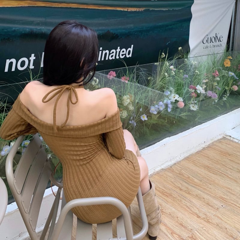 大人の抜け感と女性らしさを両立するオフショルダーニットワンピース。