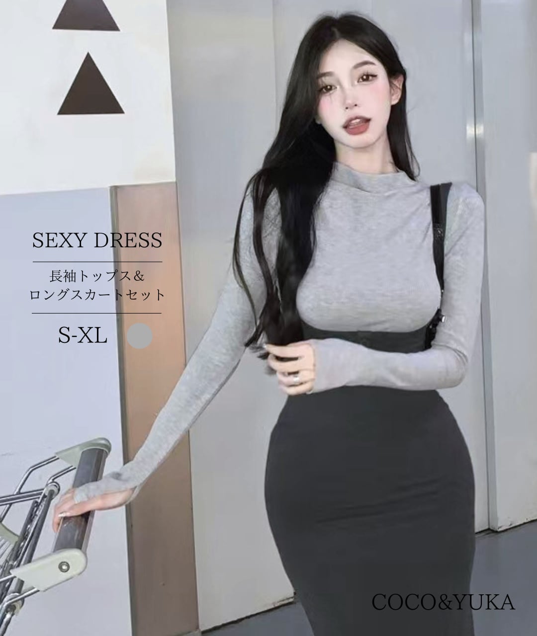 [ココアンドユカ] セクシー ロング ワンピース トップス 長袖 ハイネック タイト ロングワンピ サムホール セットアップ レディース B0G42H9BV