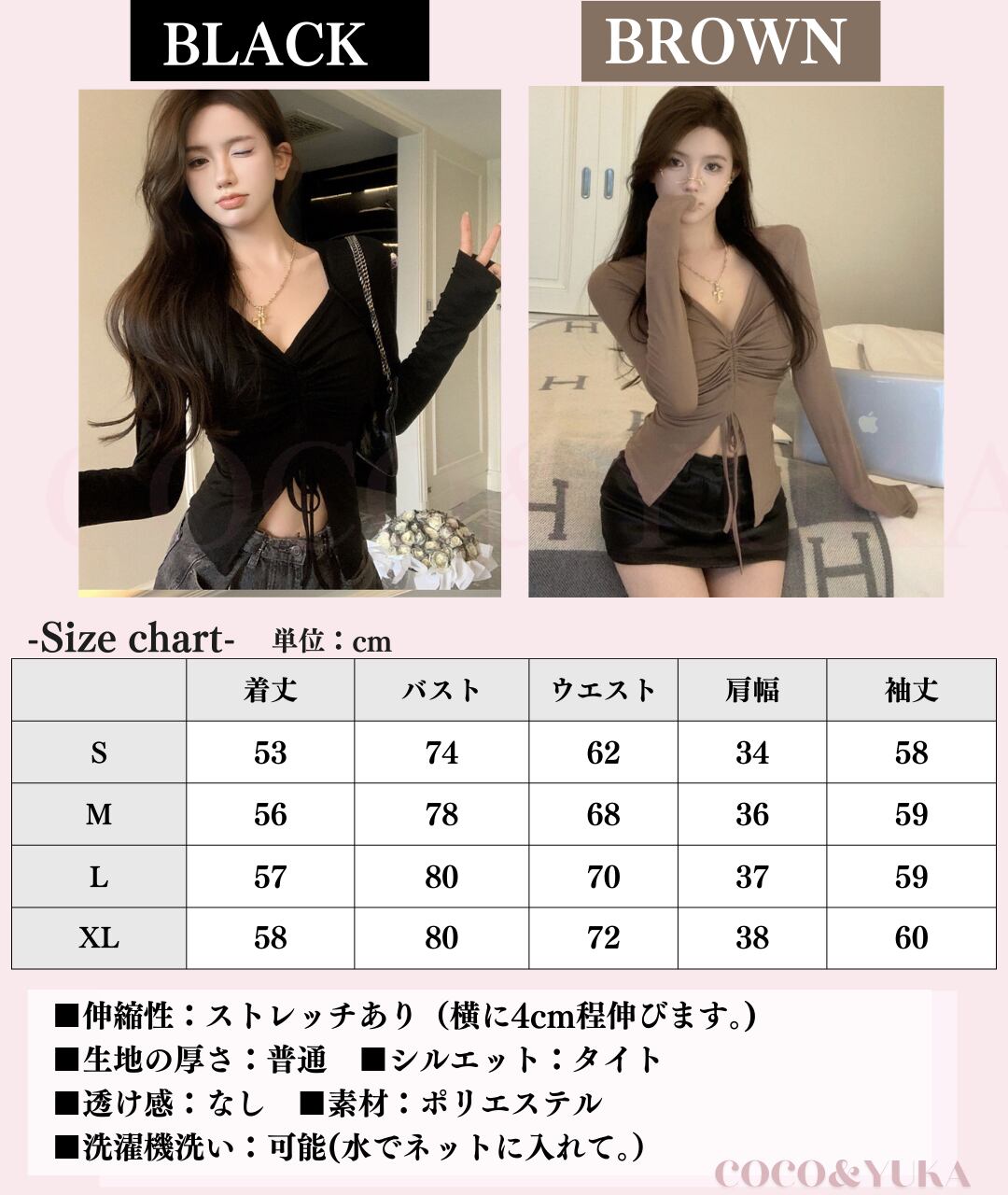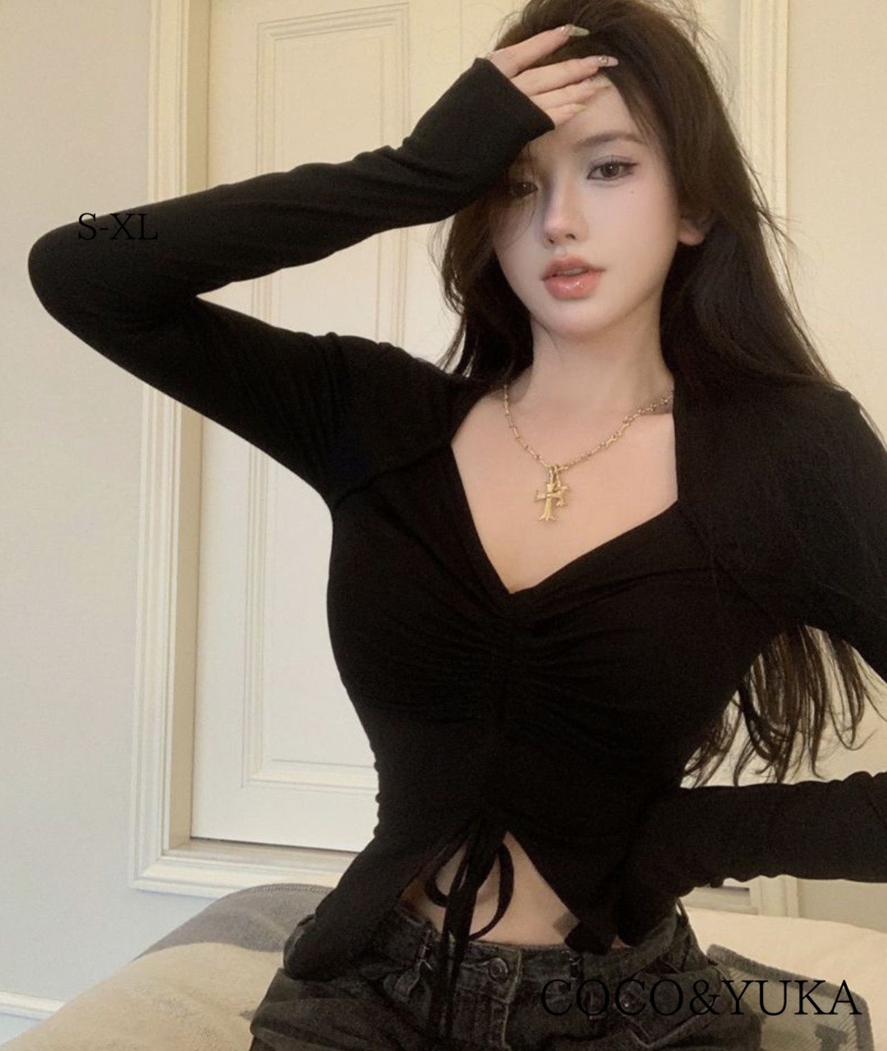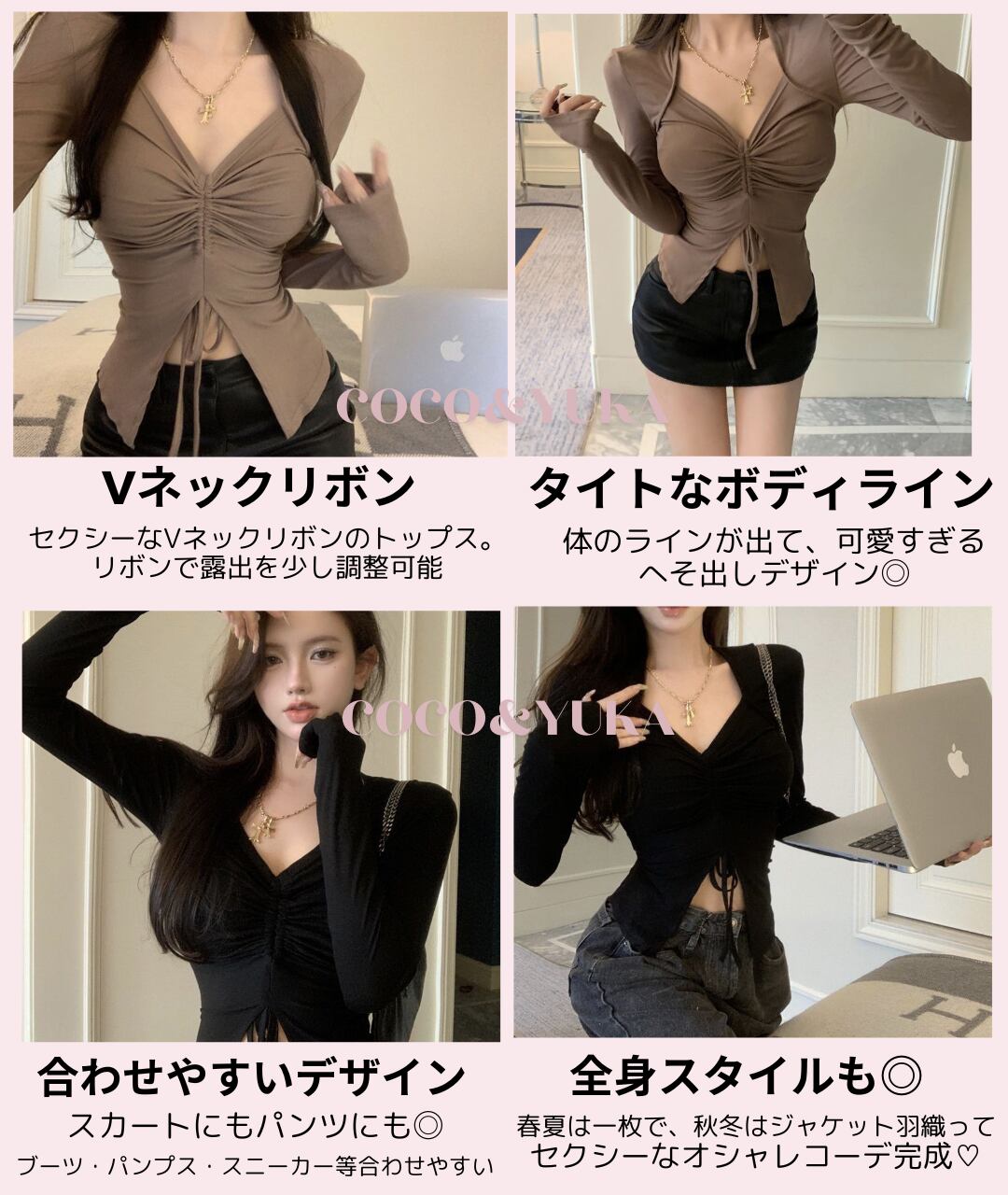 [ココアンドユカ] セクシー へそ出し トップス 長袖 Vネック レディース tシャツ 紐調整 タイト カットソー 谷間 強調 クロップド 丈 ショート ロング スリーブ カジュアル B0GL7Z74SC | COCO&YUKA