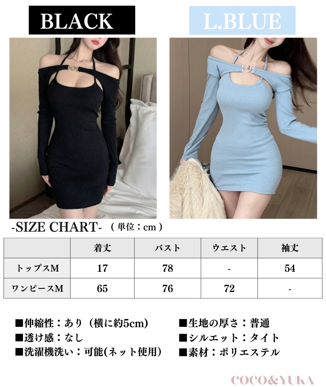 【ワンピース】 ( M ) 着丈65cm バスト76cm ウエスト72cm ※伸縮性 ストレッチ あり (横に5cm程度伸びます)