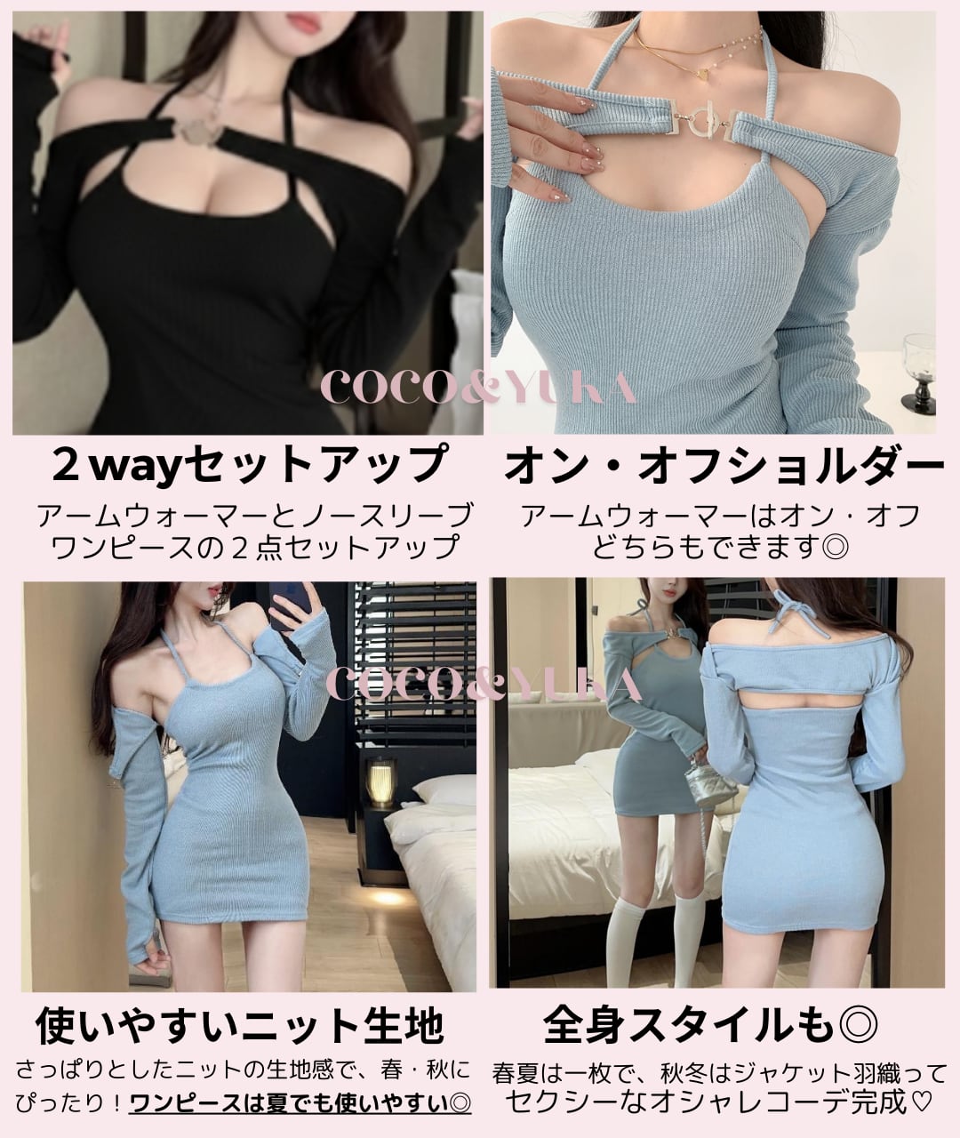 [ココアンドユカ] 胸あき ニット オフショルダー セクシー タイト ミニ ワンピース 長袖 肩出し リボン アームウォーマー セット セットアップ ミニワンピ レディース B0GMV6WWQM