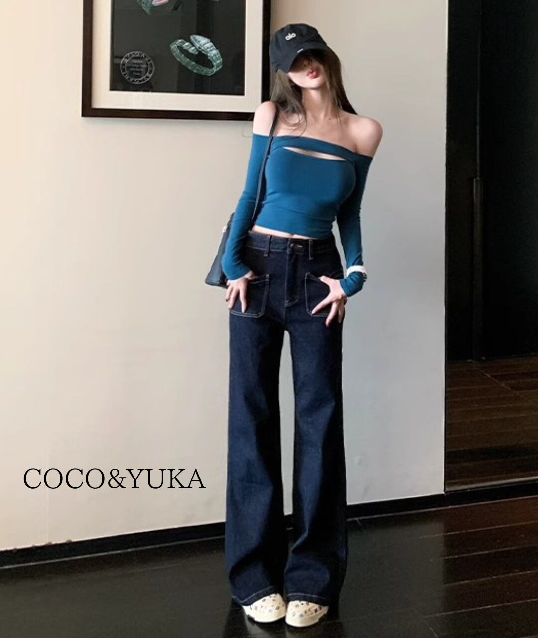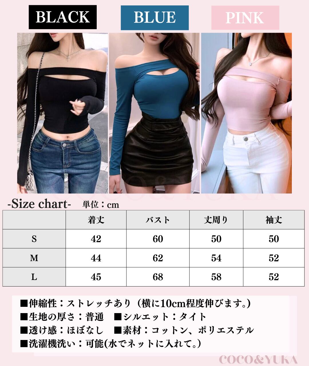 [ココアンドユカ] 胸あき オフショルダー セクシー タイト トップス 長袖 肩出し ロング Tシャツ クロップド ショート 丈 レディース おしゃれ B0GMVRNL85