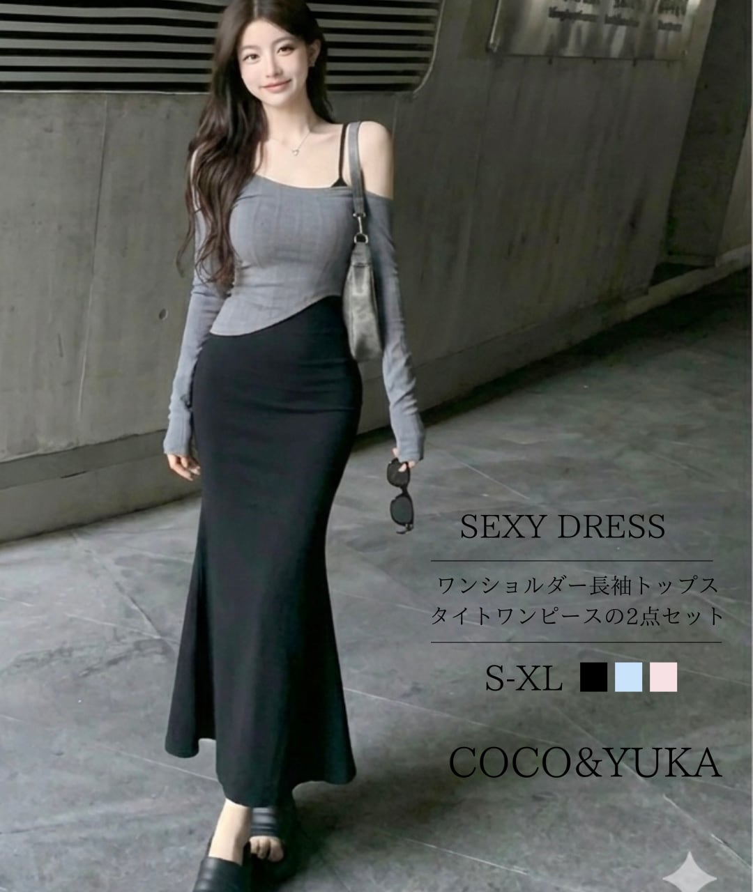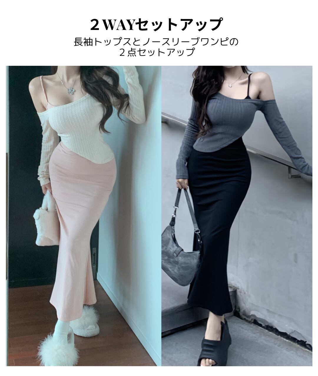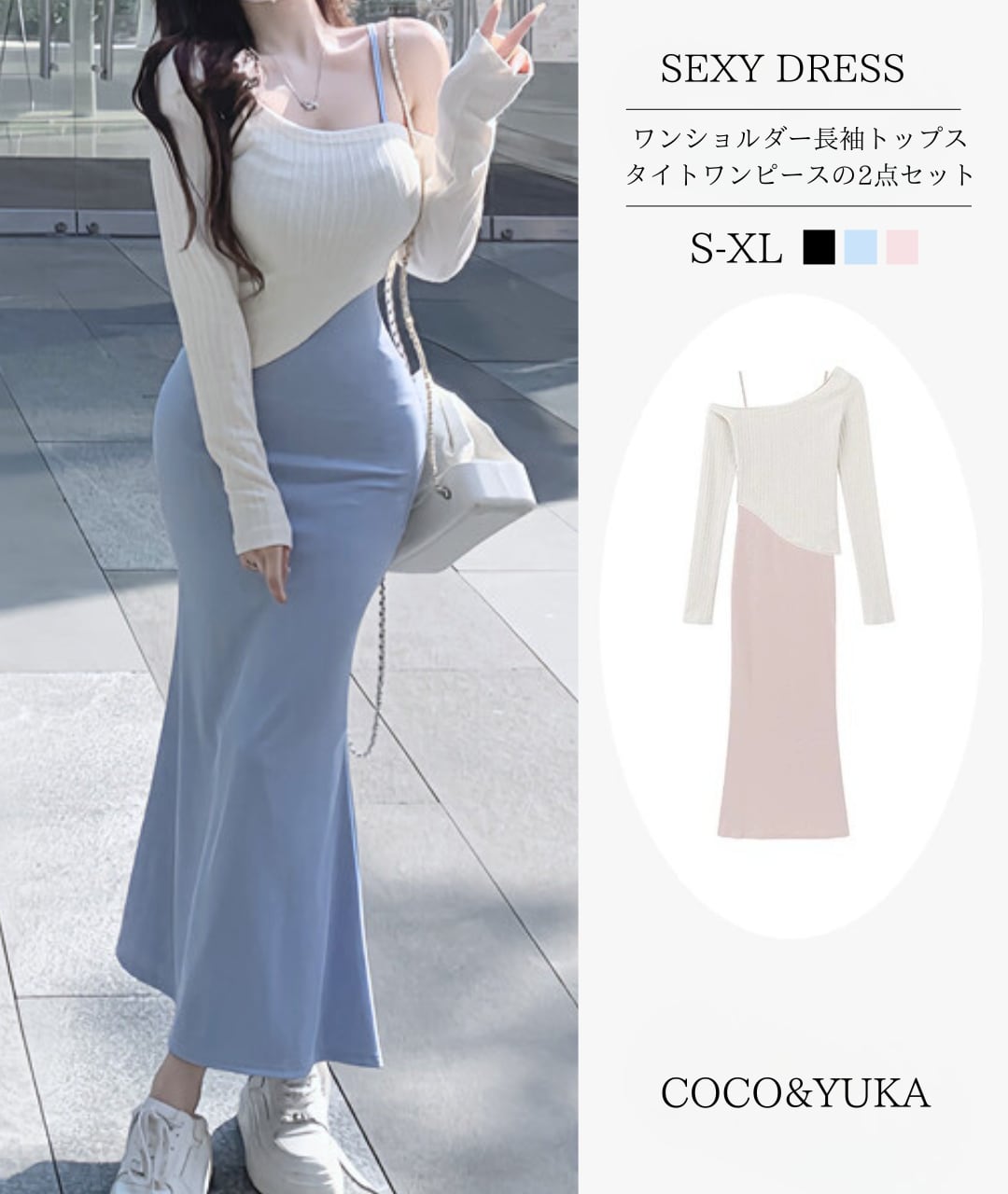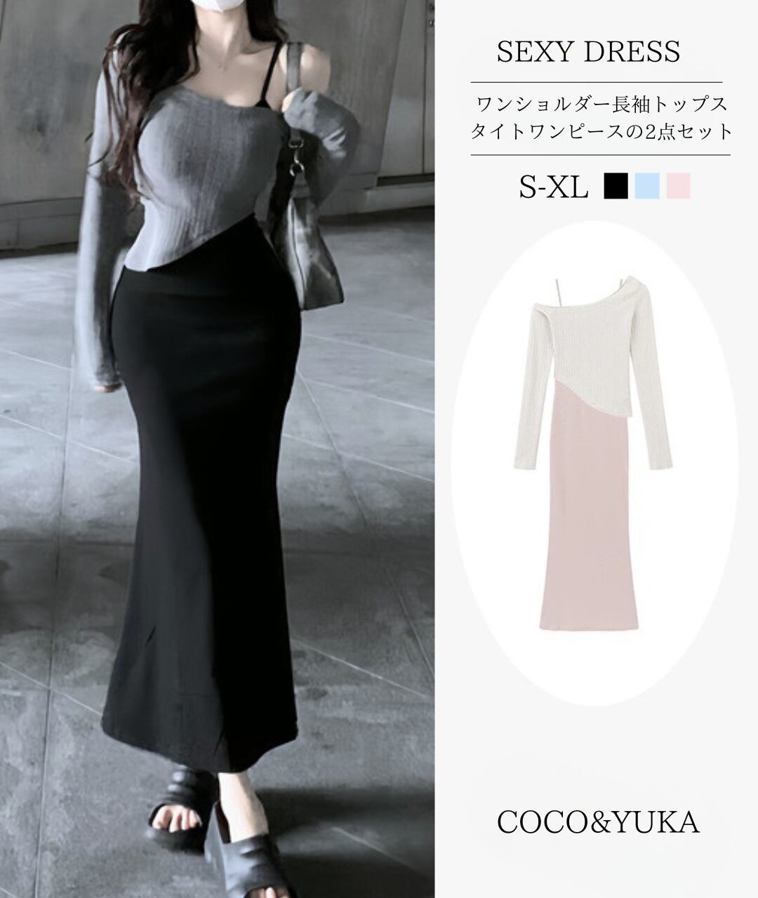 [ココアンドユカ] 2way セクシー ロング タイト ワンピース 2点 セット オフショルダー 長袖 トップス 肩出し スカート ボディコン キャミソール ロング丈 かわいい キャミワンピース ミニ ショート 丈 きれいめ 上品 デート 普段着 春 秋 B0GQM8BNZK | COCO&YUKA